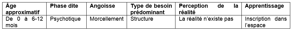 Lors de cette phase, nous vivons un univers morcelé, et sommes dans ce que l’on appelle une angoisse de morcellement, où la réalité n’existe pas vraiment pour nous, concentrés que nous sommes dans le maelstrom de sensations internes. Pour juguler cette angoisse de morcellement, d’éparpillement, à défaut d’intégration de notre schéma et de nos limites corporelles, nous avons besoin de structure, c'est-à-dire d’habitudes et de cadre routinier et sécurisant.