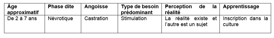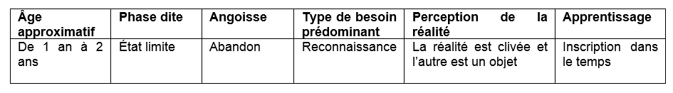 Dans cette phase, que l’on appelle la phase des états limites, nous avons besoin d’acquérir la notion du temps, qui nous permettra de vaincre la peur de l’abandon. Si maman n’est pas là, présentement, elle peut revenir, (futur), car dans le passé, elle est partie et est revenue. Je prends conscience de la notion cyclique du temps, et je prends confiance en la présence future de maman, par l’expérience de la présence, de l’absence, de la présence, de l’absence, etc.