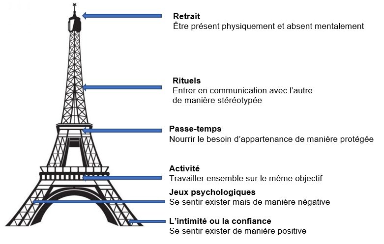 Pourquoi évoquer la célèbre tour Eiffel pour illustrer les 6 modes de structuration du temps ? Tout simplement, parce que, dans les options pour éviter les jeux psychologiques, on préconise généralement de remonter jusqu’au passe-temps pour passer du côté positif de la structuration du temps et redescendre vers l’intimité.