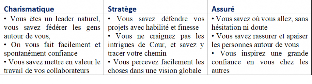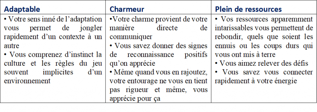 Par exemple, pour ce qui est de la structure de personnalité Audacieuse-Promoteur, les qualités les plus reconnaissables sont : adaptable, charmeur, plein de ressources. Parmi ces trois-là, quelle est celle qui vous paraît la plus facile à travailler ?