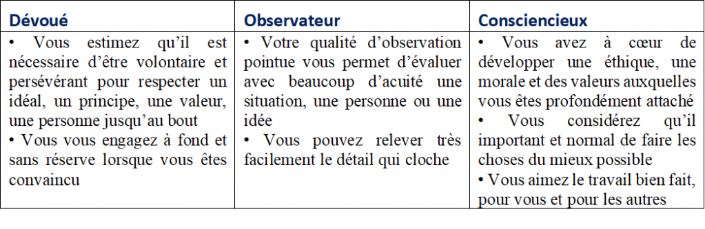 Si, par exemple, vous constatez que la structure de personnalité Audacieuse Promoteur est peu activée chez vous et que vous désirez cependant avoir plus de facilité à passer rapidement à l’action, vous pouvez choisir, parmi les 3 qualités proposées dans cette structure de personnalité- qui ne sont, bien évidemment, pas exhaustives, mais uniquement représentatives-, quelle est celle qui vous paraît la plus accessible et la plus facile à développer pour vous.
